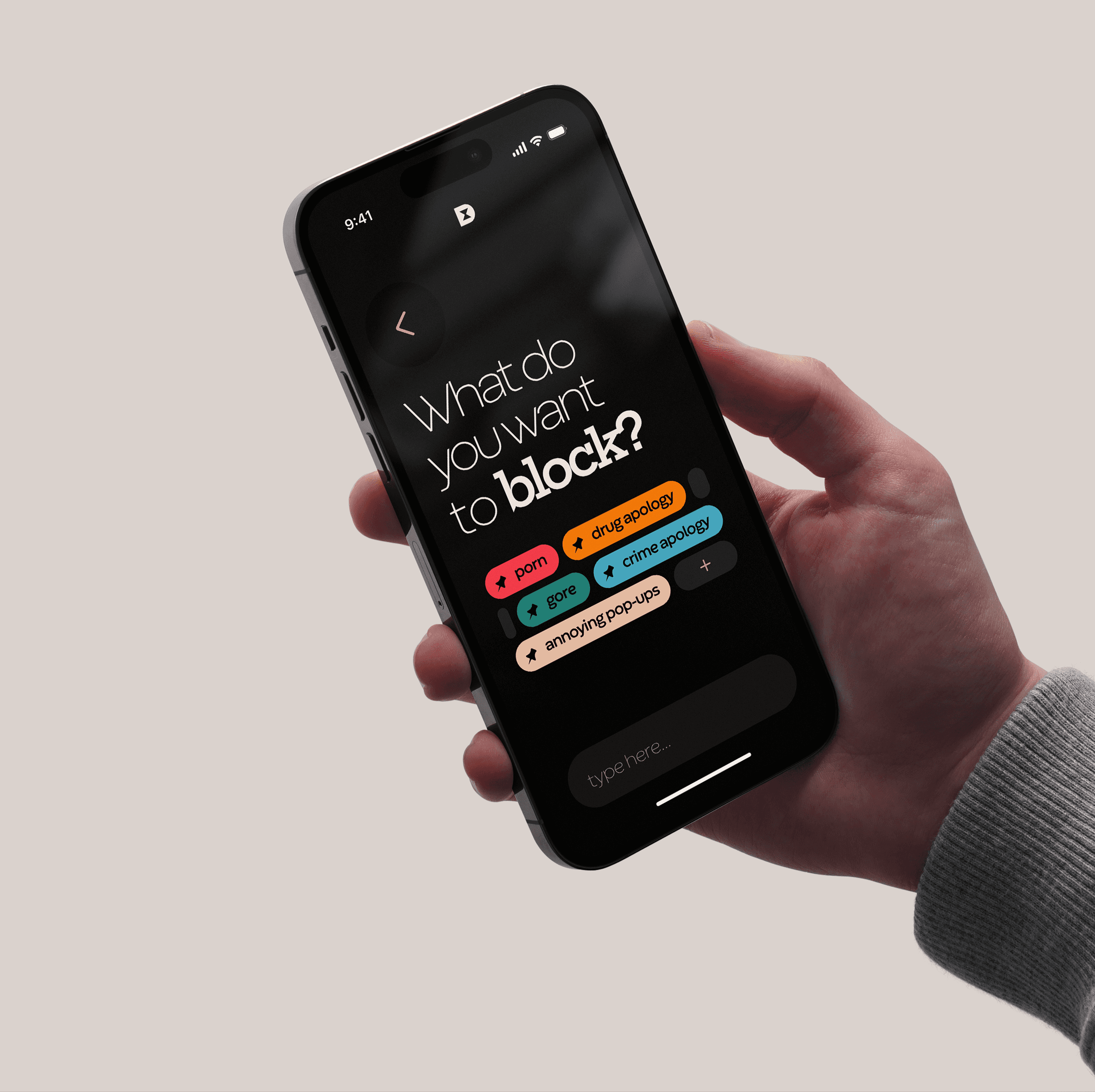 Chegar no protótipo final exigiu uma lapidação da ideia por meio de testes de usabilidade e atualização na ideação do projeto. As tomadas de decisões visavam sempre atender os requisitos dos usuários, como a própria tela de content blocker — que precisava ofertar uma simplicidade em definir quais conteúdos o usuário deseja bloquear e como o API do app poderia manipular o sistema operacional afim de bloquear na prática esses conteúdos.